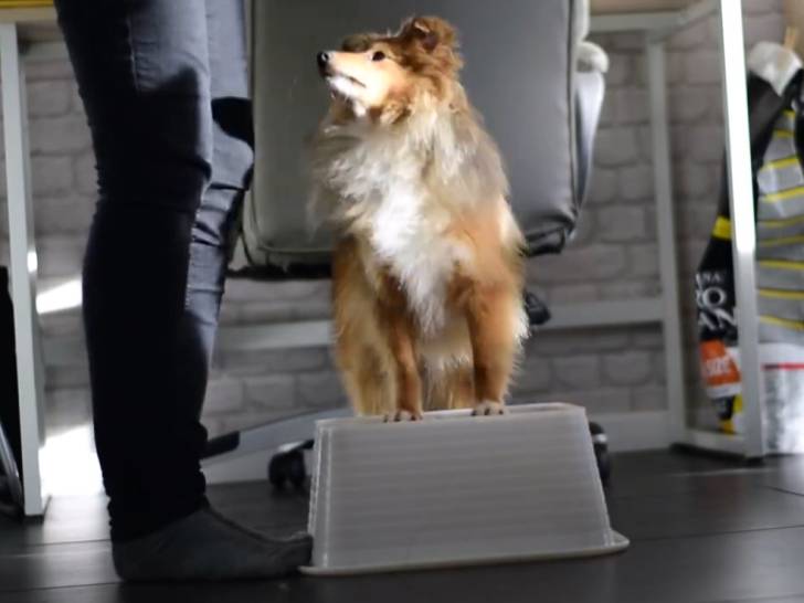Cette vidéo est un tutoriel pour apprendre à son chien à marcher au pied grâce à un exercice de proprioception. On y voit deux jeunes chiens Berger des Shetland qui doivent monter sur une boîte surélevé en plastique, d'abord en posant seulement les deux pattes avant, puis en tournant autour. L'objectif est que l'animal reste le plus près des jambes de son maître tout en restant sur la boîte.