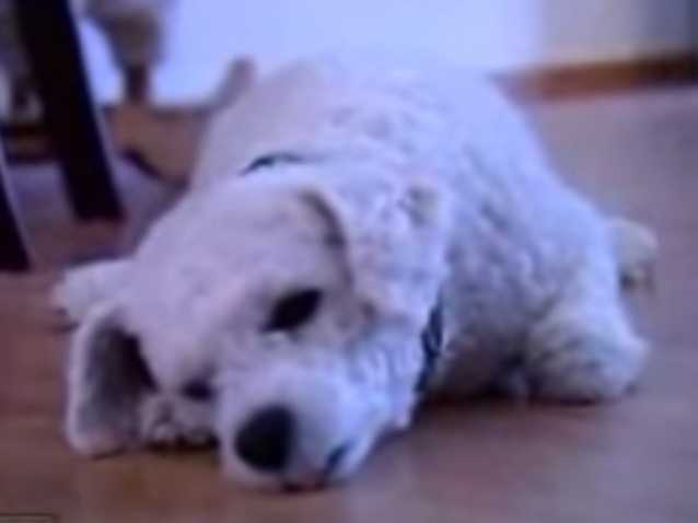 Bien que la narcolepsie touche principalement les humains, il existe aussi des chiens narcoleptiques. C'est le cas de ce petit chien blanc qui s'endort brusquement dès qu'il ressent une vive émotion. Le jeu, la nourriture, les nouvelles expériences amusantes sont autant de situations susceptibles de provoquer l'endormissement brutal et irrépressible.