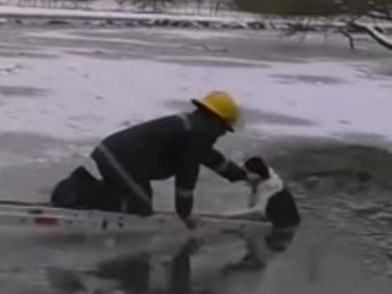 Alors qu'il est tombé dans un étang gelé – et qu'il ne peut pas en ressortir tout seul –, ce chien est secouru par un sapeur-pompier. La manœuvre est délicate, car le sauveteur risque lui aussi de se retrouver piégé. Mais heureusement, l'opération se passe à merveille et le chien peut retrouver ses maîtres.