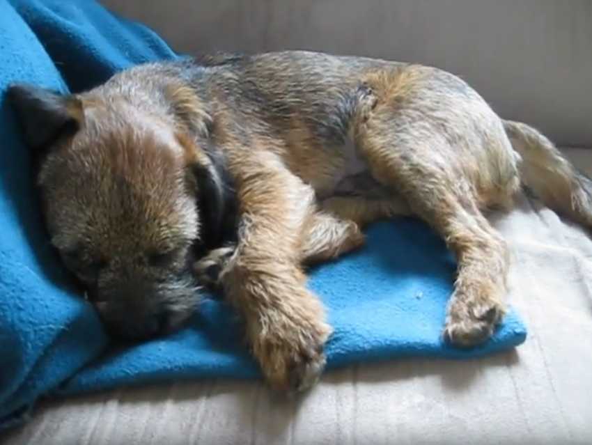 Comme les Hommes, les chiens peuvent rêver. Le cycle du sommeil est séquencé de la même manière que chez l'Homme. Ce Border Terrier, en tout cas, a l'air de beaucoup s'amuser dans son rêve ! Laissons le dormir et profiter de son rêve...