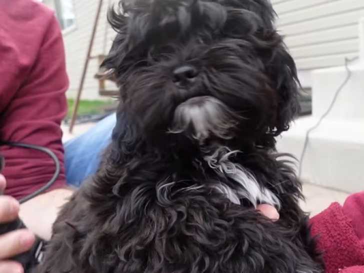 Le propriétaire d’un Shih-Poo est en train de toiletter son chien pour la première fois. Il utilise une tondeuse pour entretenir son pelage. Le chien est effrayé et doit être tenu par ses propriétaires, mais il est récompensé par des câlins après le toilettage. Le Shih-Poo est un croisement entre le Caniche et le Shih-Tzu. C’est un chien sociable et affectueux.
