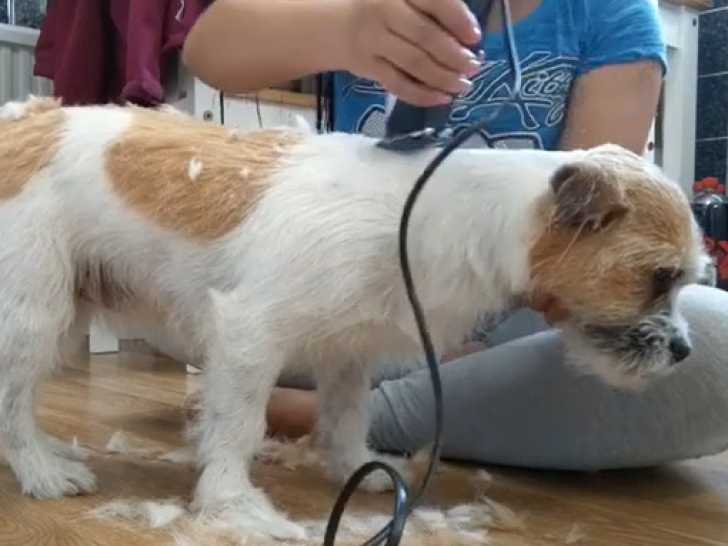 Trisha est une Jack-Tzu, issue du croisement entre un Jack Russell et un Shih Tzu, et elle est en train d'être toilettée. Sa maîtresse utilise un rasoir électrique pour lui enlever ses poils trop longs. Malgré le bruit et les mouvements de la tondeuse, Trisha se montre très obéissante et calme. Elle est récompensée par des caresses pour son bon comportement.