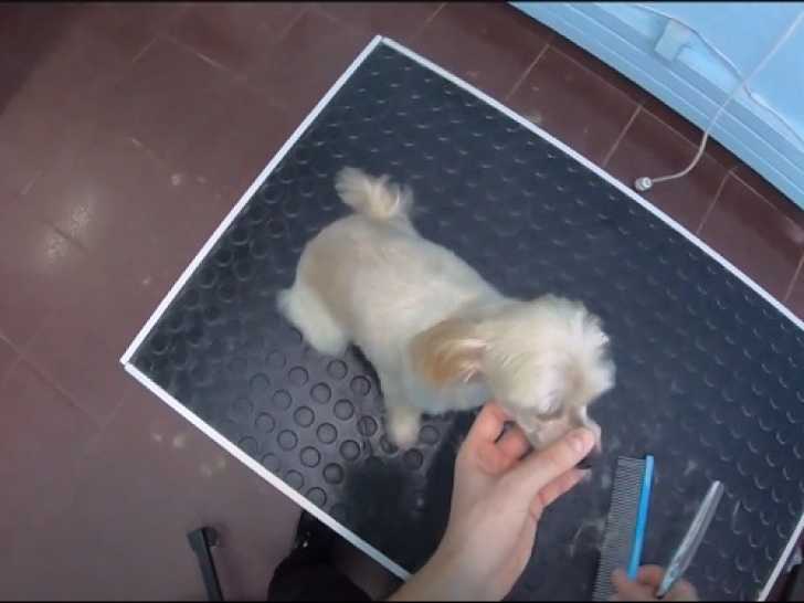 Ce Yorkinese, issu du croisement entre un Yorkshire Terrier et un Pékinois, a un rendez-vous chez le toiletteur. Il bénéficie d'un soin complet, se faisant brosser et couper les poils au peigne et aux ciseaux. À la fin de la séance, il est propre et ses poils sont égalisés. Il se montre calme et gentil, sans aucune peur ni méfiance à l'égard de ce qu'il se passe.