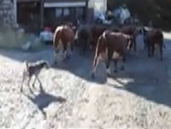 Ce Berger des Alpes donne de sa personne pour rentrer, à lui seul, l'ensemble du troupeau de vaches, guidé par la voix de son maître au loin. Le troupeau n'a plus qu'à se laisser guider vers l'enclos, le Berger des Alpes entourant l'ensemble du groupe au cas où une bête s'égare.