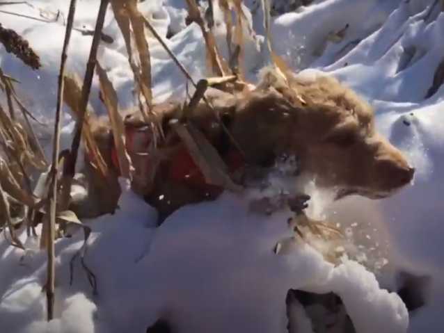 C’est donc sur un épais tapis de neige que ce chien d'arrêt fait son travail de manière efficace. En effet, après que les chasseurs aient abattu plusieurs faisans, il court dans les fourrés pour les dénicher et les ramener au plus vite.