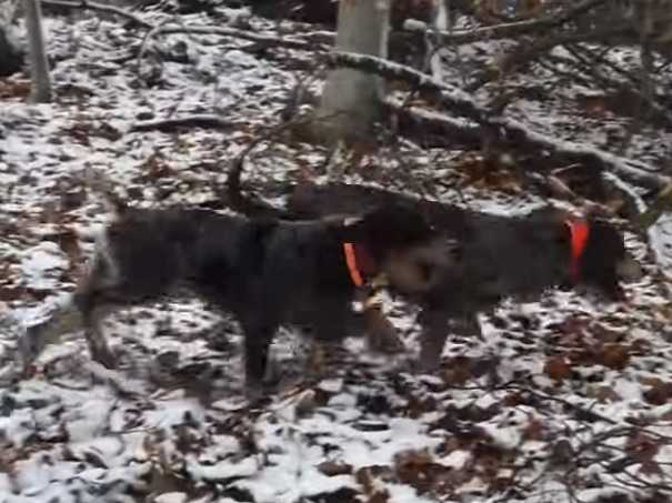 Chasse aux chiens courants sur lièvres en Haute-Loire, où l'on voit deux Griffons Bleus de Gascogne sur la piste d'un lièvre, que l'on voit passer en courant au début de la vidéo.