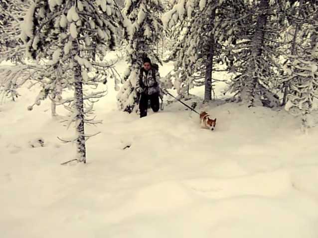 Le chasseur poursuit sa traque en compagnie de son Spitz de Norbotten. Il s'agit ici d'une chasse en solitaire et tous deux arpentent ardemment la forêt à l'affût du moindre gibier.