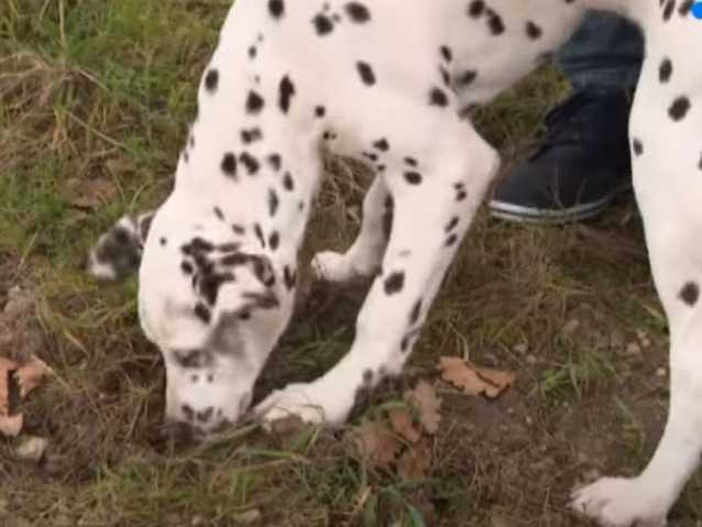 Pour commencer, on peut voir à l'œuvre une jeune femelle Dalmatien de 4 mois qui commence à acquérir un certain savoir-faire. C'est ensuite une Braque de Weimar plus vieille et plus expérimentée qui réussit à dégoter une truffe d'une taille assez exceptionnelle.