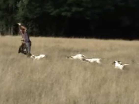Entrainement de chiots Gascons Saintongeois de trois mois sur peau de sanglier. Assez rare d'obtenir ce résultat à ce jeune âge qui démontre souvent des années de sélection sur les origines. Le chasseur/dresseur trace une piste artificielle avec une peau de sanglier qu'il traîne lentement sur le sol côté poil. Il fait d'abord de petits cercles et au fur et à mesure augmente la difficulté. Les chiens de chasse sont récompensés par la peau que le dresseur leur abandonne.