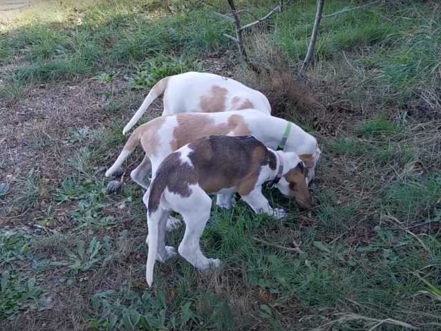 Malgré leur jeune âge (10 semaines), des chiots Grands Griffons Vendéens ont déjà un flair très développé. Ils reniflent une piste de sang, ce qui est un entraînement nécessaire pour chasser le grand gibier. Ces chiens de chasse à courre, bien plus à l'aise dans la nature qu'en ville, sont utilisés pour traquer le sanglier.