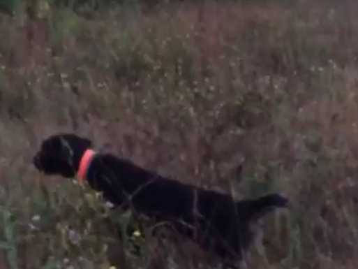 Voici la vidéo d'un chien Draathaar, prise lors d'une partie de chasse. Il se trouve en position d'arrêt pour pouvoir suivre et surprendre sa proie. On le voit très concentré et immobile, à l'affut du moment opportun pour attaquer. Son maître en profite pour filmer cette belle preuve de dressage réussi.