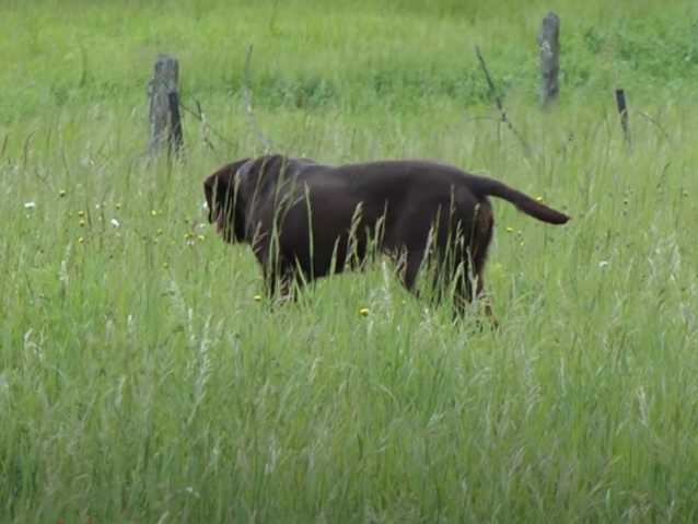 C’est sous le regard vigilant de ses maîtres qu'un Pudelpointer s’entraîne dans un champ aux couleurs printanières. Il court tout d’abord dans tous les sens à la recherche d’une piste. Quand il semble avoir trouvé le gibier, le chien de chasse marque l’arrêt pendant de longues minutes et observe en silence.