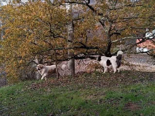 Voici des Mâtins des Pyrénées qui prennent à coeur leur travail, à savoir garder l’ensemble de la propriété. Et il ne fait aucun doute qu’ils l’accomplissent avec grand professionnalisme. En effet, ils sont à l’affût et personne ne peut pénétrer l’enceinte du territoire sans qu’ils sonnent l'alerte quant à cette intrusion. Beau boulot et bravo à ces gardiens.