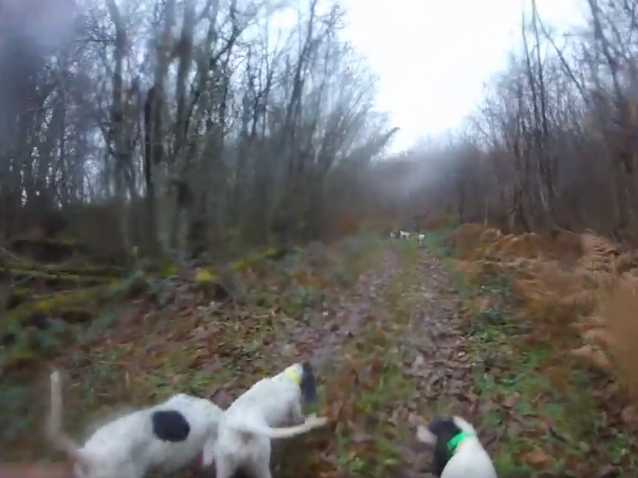 L'Ariégeois est un chien courant utilisé pour le gibier à quatre pattes comme le chevreuil, le lièvre ou encore le sanglier. On ne voit pas de chevreuil ici, il est certainement plus loin devant les premiers chiens de la meute, mais le travail du maître qui consiste à les encourager pour pousser l'animal toujours plus avant.