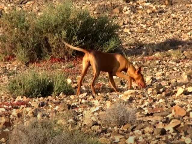 Au beau milieu d'une vallée des plus arides et rocailleuses, voici un Podenco Canario qui se balade sous un soleil de plomb. Il flaire chaque buisson qu’il rencontre à la recherche d'une trace de gibier. Il arpente méticuleusement le terrain sans se soucier de la chaleur, la traque étant son seul objectif.