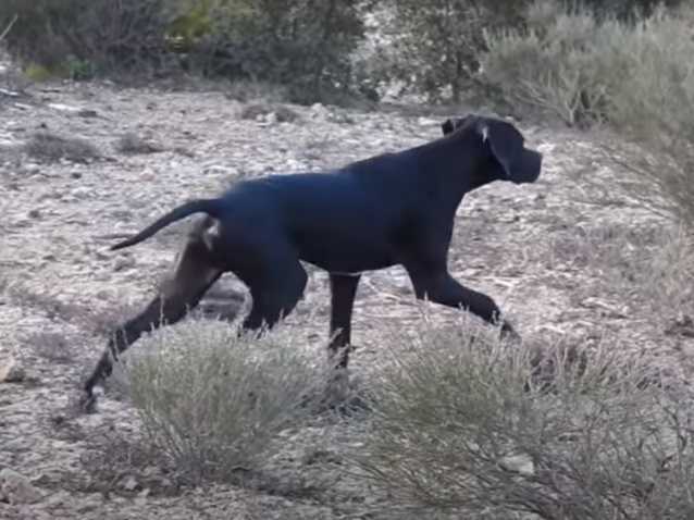 Dans la campagne aride et rocailleuse, un jeune Pointer s’entraîne à la chasse avec application. Une fois qu’il a repéré une proie, ce chien de chasse avance doucement et se met en position d'arrêt lorsqu'il est très proche de l'animal. Le gibier ainsi signalé, le chasseur n'a plus qu'à le tirer au moindre signe de mouvement.