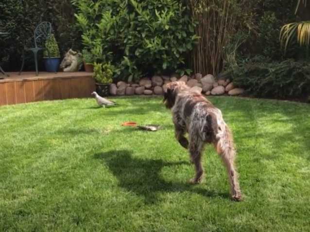 Un Korthals est ici filmé par sa famille en train de marquer l'arrêt devant un pigeon, qui ose impunément se balader dans son jardin. Il résiste de longues secondes avant de céder à son instinct et tente d'attraper le volatile, sans succès.