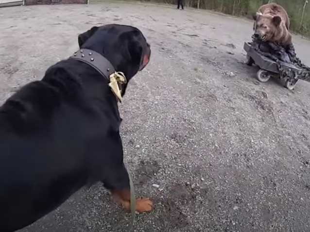 Dans un terrain vague, un Rottweiler va se retrouver devant un ours factice et sa réaction ne se fait pas attendre. Il se met à aboyer dès qu'il a remarqué au loin le faux animal. Puis, au fur et à mesure que l’ursidé se rapproche, le Rottweiler fait face sans aucune peur. Force est de constater que ce chien de garde est prêt à affronter son adversaire.