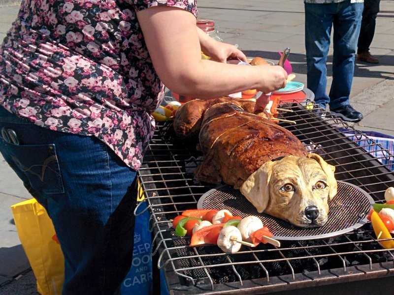 À l’occasion de la journée mondiale du chien du 26 août 2016, des membres du groupe PETA (mouvement Pour une Éthique dans le Traitement des Animaux) ont organisé un barbecue un peu particulier, dans le quartier de Trafalgar Square, à Londres. Après avoir fait griller un faux chien, fabriqué à partir de seitan, un aliment à base de protéines de blé, ils ont proposé aux passants d’en déguster un morceau gratuitement.