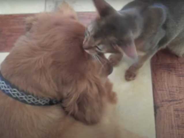 Rudy, un chat Abyssin, partage des moments de complicité avec Ellie, un Golden Retriever. Le petit félin adore lécher la tête de la chienne et se blottir contre elle. Très calme, Ellie semble apprécier ces attentions. Cela prouve que chiens et chats peuvent parfois faire bon ménage, à condition que la cohabitation se fasse dès le plus jeune âge.