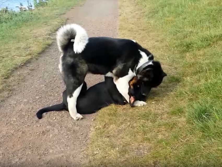 Un Akita Américain et un Rottweiler prennent plaisir à passer du temps ensemble. Le Rottweiler tente de se sortir des pattes de l'Akita Américain qui use de sa force et de son gabarit pour le retenir. Ce n'est qu'un jeu, mais la force de l'Akita Américain impressionne.