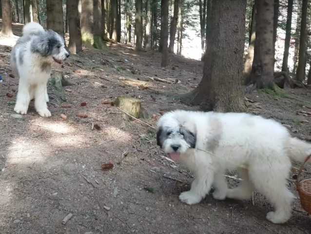 Une famille se balade en forêt avec ses deux Bergers Roumains de Mioritza. Conduits par les enfants, les deux chiens respectent leurs petits maîtres en ne tirant pas sur leur laisse. La route est escarpée : ce n'est cependant pas un problème pour ces chiens de bergers : ils sont en effet agile et musclés et se déplacent avec aisance sur n'importe quel type de terrain.