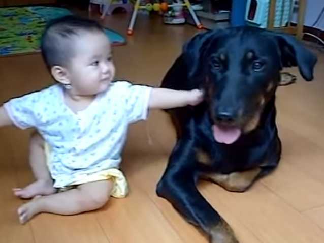 Un Beauceron se révèle ici d'une grande patience avec un bébé. Un chien qui a reçu une bonne éducation et une socialisation de même n'a pas de raison d'être dangereux avec un tout petit. Cependant, le Beauceron est puissant et a fort caractère, il peut jouer de façon un peu trop rude pour un bambin sans pour autant être agressif. La surveillance des parents n'est certainement pas de trop.