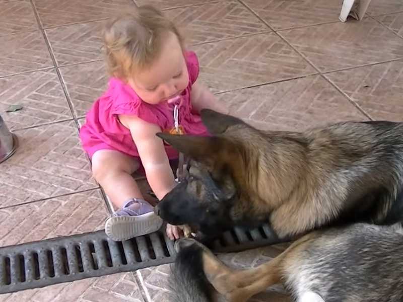 Hatchi un Berger Allemand et une fillette jouent tranquillement ensemble. La fillette n'est guère impressionné par le chien et le chien fait attention à la petite fille. Une belle complicité est en train de s'installer entre ces deux là.