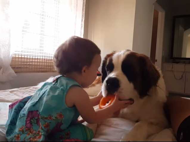 Il est bien connu que le Saint-Bernard adore les enfants. Dans cette vidéo, un bébé de dix mois s'amuse avec son chien, un Saint-Bernard âgé de trois ans. Ce dernier, malgré son gabarit, se montre attentionné et n'est pas brusque en jouant avec le bébé. Ce chien est donc parfaitement adapté à la vie familiale.