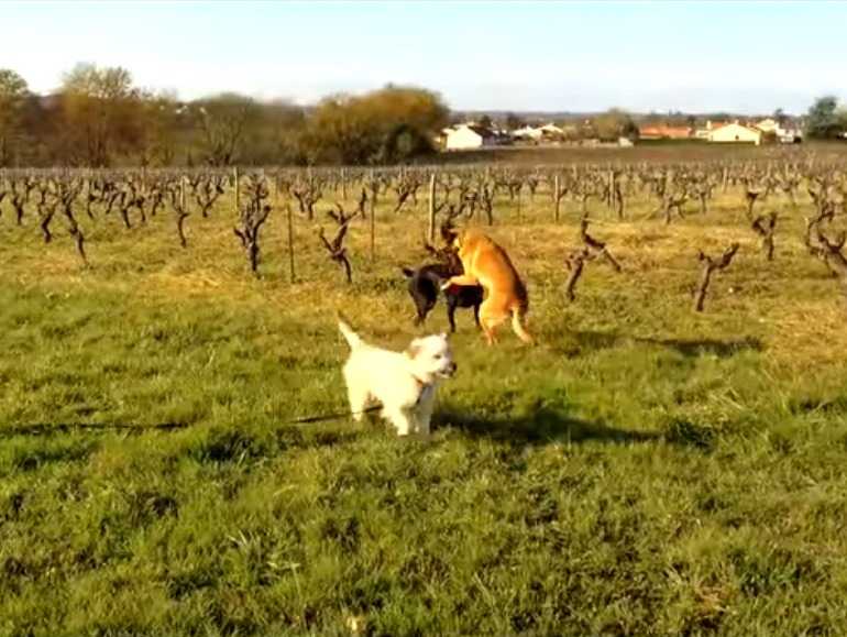 Le premier contact entre un chiot et ses congénères est décisif afin d'éviter toute apparition d'un comportement agressif. Ce chiot Berger des Pyrénées vit, dans cette vidéo, son premier contact avec d'autres chiens, s'habituant peu à peu à leur présence. Une fois habitué, la troupe part ensemble en balade, le chiot interagissant davantage avec ses congénères.
