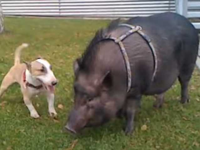 La cohabitation inter-espèces est possible : ce Bull Terrier Miniature et ce cochon domestique le prouvent dans cette vidéo. Le chiot veut à tout prix que son ami réagisse et joue avec lui : il aboie, fait des bonds autour de lui pour provoquer l'animal. Cependant, le cochon reste placide et continue à brouter l'herbe sans porter la moindre attention au jeune chien.