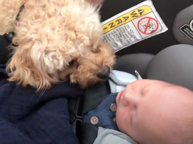 Un tout jeune bébé, né il y a seulement quelques jours, est présenté au Caniche de la famille. Le chien, bien que très curieux, adopte un comportement idéal avec le petit d'humain en restant calme et précautionneux. Toutefois, cet exemple ne dispense pas de prendre des précautions lorsqu'il s'agit de faire cohabiter un chien avec un bébé, notamment une surveillance constante.
