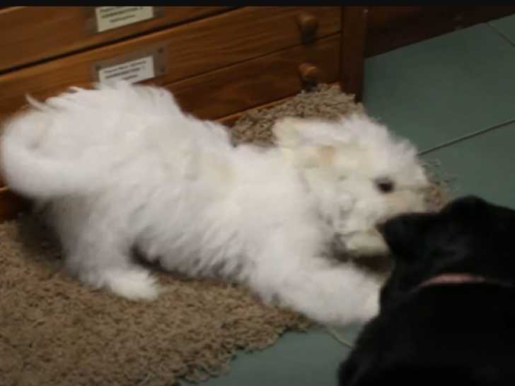 Ce Cav-A-Malt au pelage blanc a trouvé un nouveau compagnon de jeu. Il adore faire semblant de l'attaquer, bondissant sur lui tout en aboyant joyeusement. Il est plein d'énergie et se révèle être un redoutable adversaire. Le Cav-A-Malt est issu du croisement entre un Bichon Maltais et un Cavalier King Charles Spaniel.