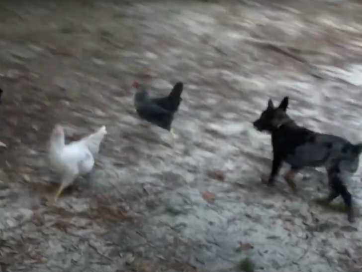 Ce jeune chien Catahoula Heeler rencontre des poules pour la première fois. Il leur court après, plein d'énergie et très déterminé. Issu du croisement entre le Chien Léopard Catahoula et le Bouvier Australien (Heeler), le Catahoula Heeler est un chien très intelligent et amical qui n'hésite pas à aller vers d'autres animaux.