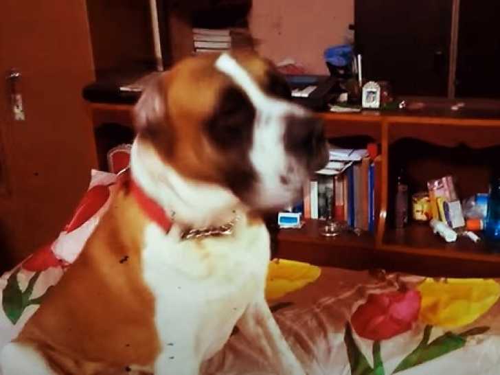 Ce Saint-Dane passe un moment complice avec sa maîtresse. Allongé confortablement sur le lit dans la chambre, il se repose paisiblement, ses yeux tournés vers elle avec affection. Il espère recevoir quelques douces caresses. Le Saint-Dane est le fruit du croisement entre le Saint-Bernard et le Dogue Allemand, c'est un compagnon loyal et amical.