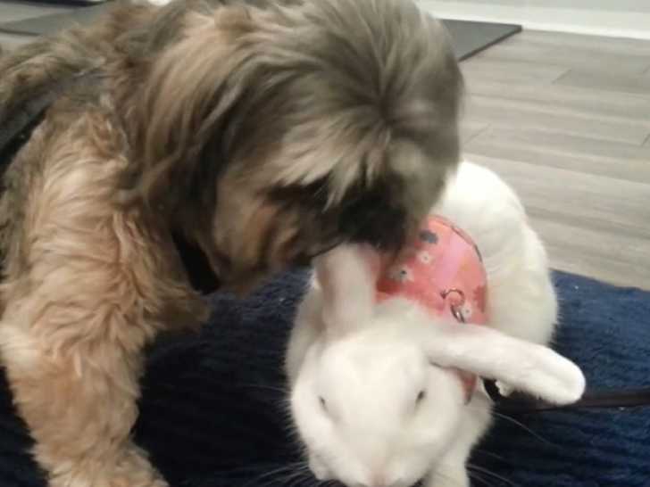 Bear, un Shiffon curieux, observe avec intérêt le nouveau lapin adopté par ses propriétaires. Il s'approche doucement pour le renifler, puis finit par lui lécher les oreilles. Le lapin, quant à lui, reste calme et ne bouge pas. Le Shiffon est issu d’un croisement entre le Shih Tzu et le Griffon Bruxellois.