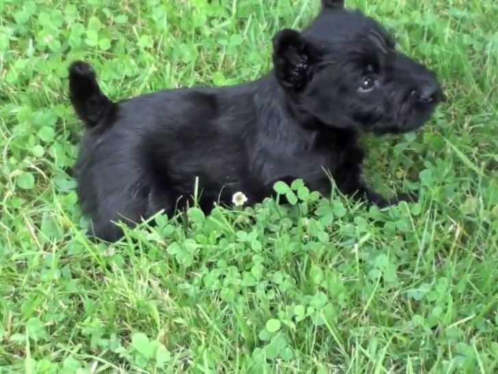Tous ces petits chiots Scoodle, qui ont moins d'un mois, se déplacent timidement dans l'herbe. Sous le regard attentif de leur mère, ils découvrent l'environnement extérieur pour la première fois ensemble. Résultat du croisement entre le Caniche et le Scottish Terrier, le Scoodle est un chien calme, amical et entretient une très bonne relation avec ses maîtres.