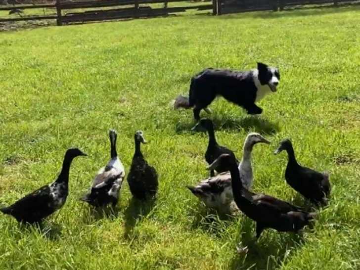 Cet English Shepherd s'entraîne pour la première fois à guider les mouvements des canards de la ferme. Sa propriétaire lui donne les ordres de ce qu'il doit faire. Très obéissant, il réussit parfaitement à diriger les canards. L'English Shepherd est un compagnon idéal pour la conduite et le rassemblement du bétail.