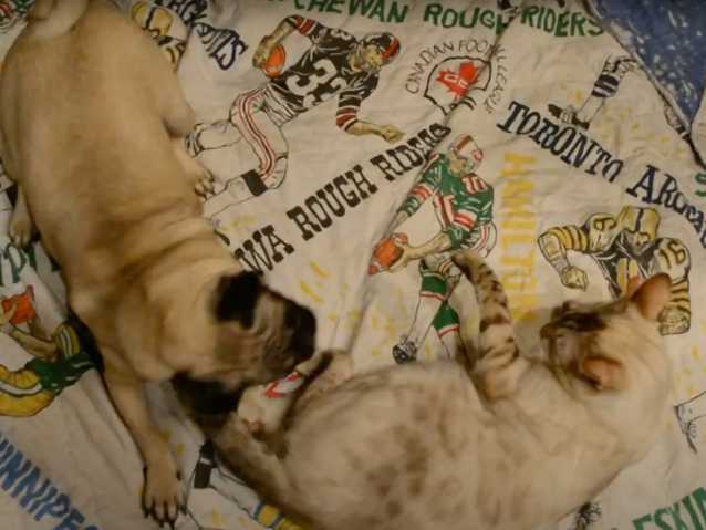 Dans cette vidéo, un chat Bengal et un chien Carlin chahutent sur un lit. Au programme, des sauts et des roulades dignes d'une scène d'action dans un film. Le chien essaie de mordiller son adversaire, qui riposte avec des coups de pattes vifs et affirmés. Alors, qui remportera la partie ?