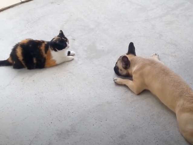 On dit parfois que les chats ont peur des chiens. Or, cette vidéo prouve que c'est loin d'être toujours le cas ! Elle montre en effet un chat Européen tricolore qui défend son territoire face à un chien Bouledogue Français et ne se laisse pas impressionner, bien au contraire. Il semble intrigué par le chien qui, quant à lui, a plutôt l'air de se jouer de la situation...