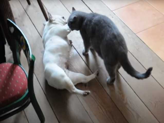 S’ils n'ont pas une corpulence similaire, voici un Bouledogue Français qui est presque de la même taille que le British Shorthair de cette vidéo. Le chien et le chat passent du bon temps ensemble et jouent comme des petits fous. Une telle entente entre ces deux animaux de compagnie fait plaisir à voir.