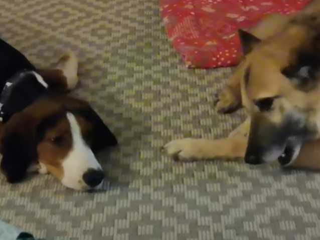 Dans cette courte vidéo, un Chien Courant Finlandais, ou Suomenajokoira, observe avec une envie non dissimulée la friandise que mâchonne son compagnon. Pas prêteur, ce dernier l'ignore royalement.