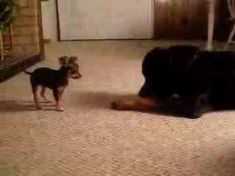 Vidéo amusante avec la différence de taille entre le Chihuahua et leRottweiler. Les deux chiens jouent ensemble et le poids plume aimerait bien attraper le jouet du poids lourd mais cela semble difficile. Finalement le petit bout abandonne la partie et vaque à ses occupations