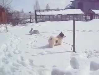 Étant donné que le lapin est attaché à un piquet, le Laïka lui court derrière et tous deux font quelques tours de pistes, en toute amitié et complicité.