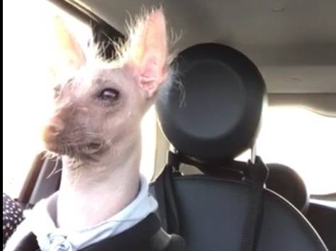 Ce Chien Nu du Pérou se retrouve embarqué dans une virée en voiture. Mais à la vue de son expression, soit il n'apprécie pas l'idée, soit il désapprouve le pilote. A moins qu'il ne sache que cette sortie implique une visite chez le vétérinaire et, dans ce cas, on peut comprendre pourquoi il est aussi sérieux.