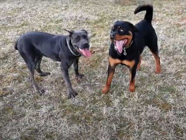 S'agissant d'individus socialisés et éduqués, les deux molosses s'entendent bien et jouent ensemble malgré qu'ils soient classés comme chiens dangereux par la loi dans certains pays. Ainsi, ils se sautent dessus l’un après l’autre dans un corps à corps amical et sans aucune agressivité.