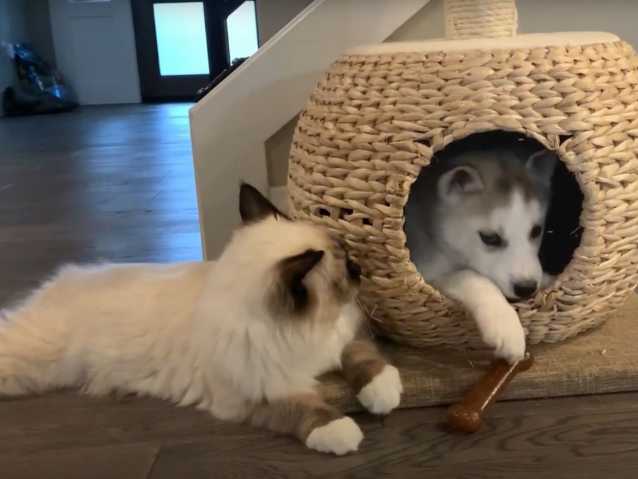 Un chaton Ragdoll et un chiot Husky Sibérien semblent se découvrir. L'approche n'est pas aisée et le chaton se montre quelque peu réticent sur la fin de la vidéo. La cohabitation entre chats et chiens se passe généralement bien quand les individus s'habituent l'un à l'autre très tôt dans leur vie, même si cela ne se déroule pas toujours sans heurts.