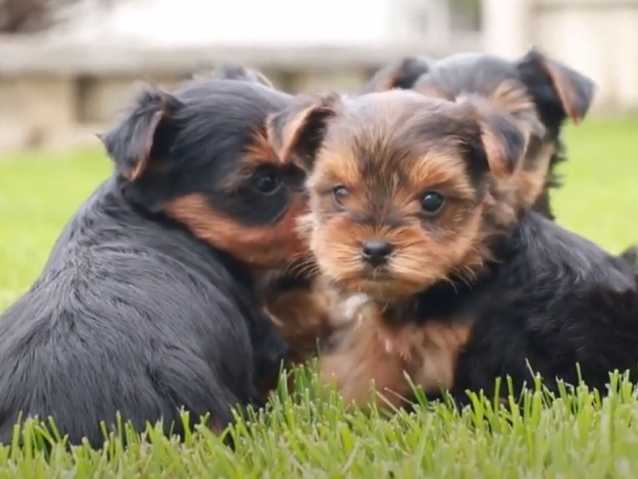Quatre chiots Morkie se détendent sur l'herbe. Pendant que certains se prélassent, d'autres courent, sautent, jouent et viennent dire bonjour à la caméra. La socialisation des chiots et la découverte de nouveaux environnements sont des choses primordiales et indispensables à leur équilibre, et il semblerait que jouer dans l'herbe plaisent beaucoup à ces quatre-là.