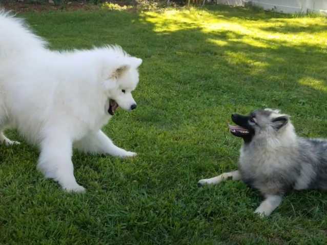 Un combat amical entre deux animaux d'un même foyer est donc normal et est même sain : ce Samoyède et ce Keeshond l'ont bien compris. A tour de rôle, ils se sautent dessus et se provoquent : ils grognent et aboient, simulent des morsures, sans jamais se blesser. Le Keeshond respecte son aîné en montrant son ventre en signe de soumission.