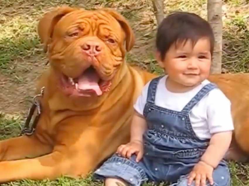 Vous verrez dans cette vidéo, plusieurs Dogues de Bordeaux en train de divertir des bébés en jouant avec eux et en les faisant rire.
